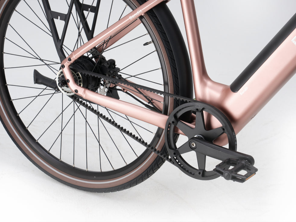 Sur notre Bandit, les câbles sont élégamment intégrés au cadre, ce qui contribue non seulement à une esthétique épurée, mais aussi à la durabilité du vélo. Grâce à une protection optimale contre l'usure et les dommages, les câbles restent en parfait état plus longtemps, réduisant ainsi les besoins d'entretien et prolongeant la durée de vie du vélo. Il en résulte un design plus élégant aux avantages pratiques indéniables.